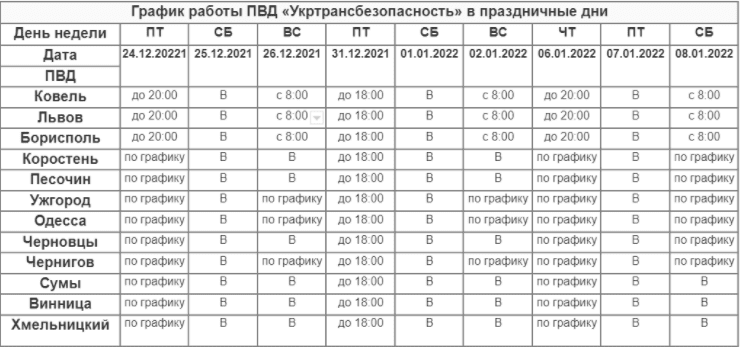 The State Service of Ukraine for Transport Safety (Ukrtransbezpeka) has published on its website the schedule of work of permitting points (PSD) on the eve of holidays and public holidays from December 24, 2021 to January 8, 2022.